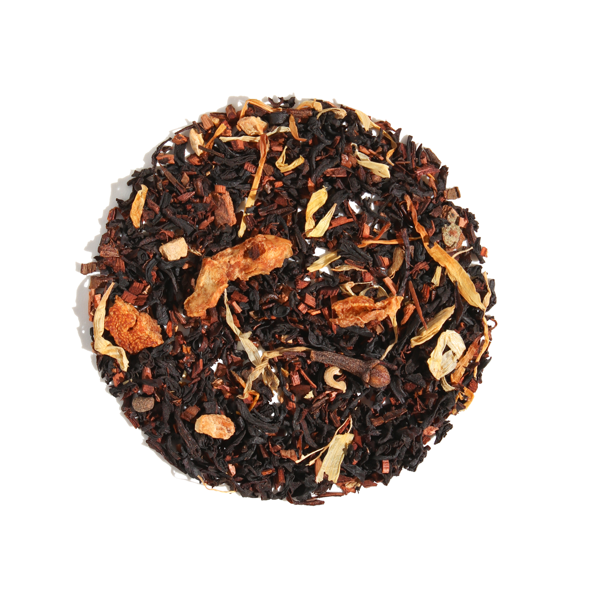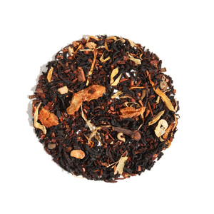 Ingredients: Black Tea, Honeybush Tea, Cinnamon, Ginger, Orange Peel, Cardamom, Clove, Black Pepper, Calendula, Natural Flavor.